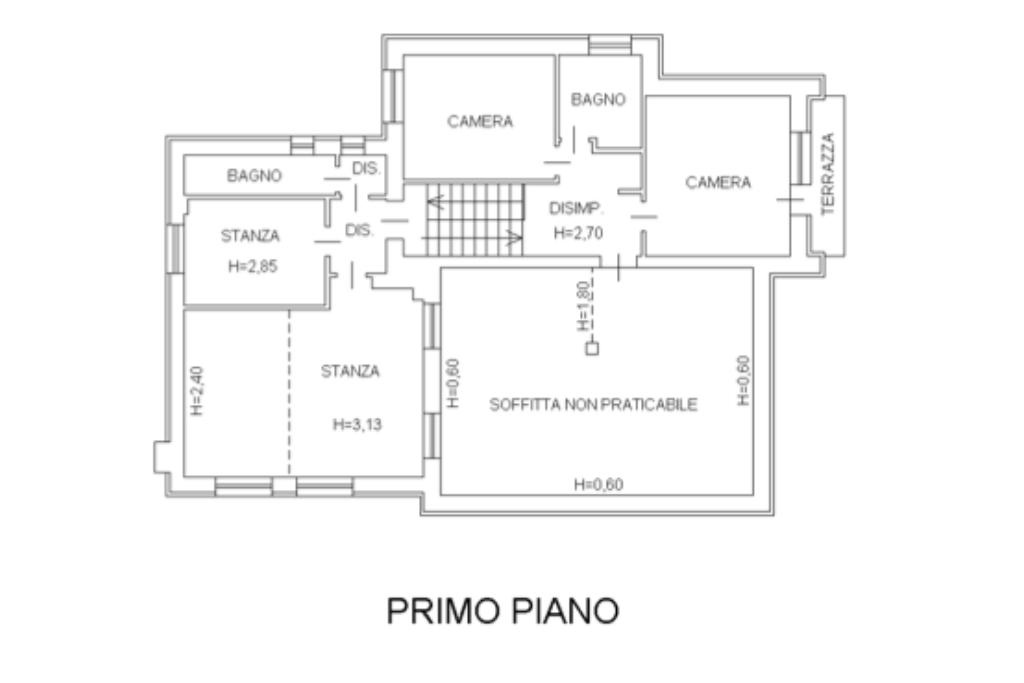 Salendo al primo piano, un disimpegno collega due camere da letto, un bagno con vasca e l’accesso alla soffitta non praticabile. Proseguendo, si sviluppa un ulteriore livello con altre due camere e un bagno con doccia, rendendo l’immobile particolarmente versatile e adatto anche a soluzioni plurifamiliari.
