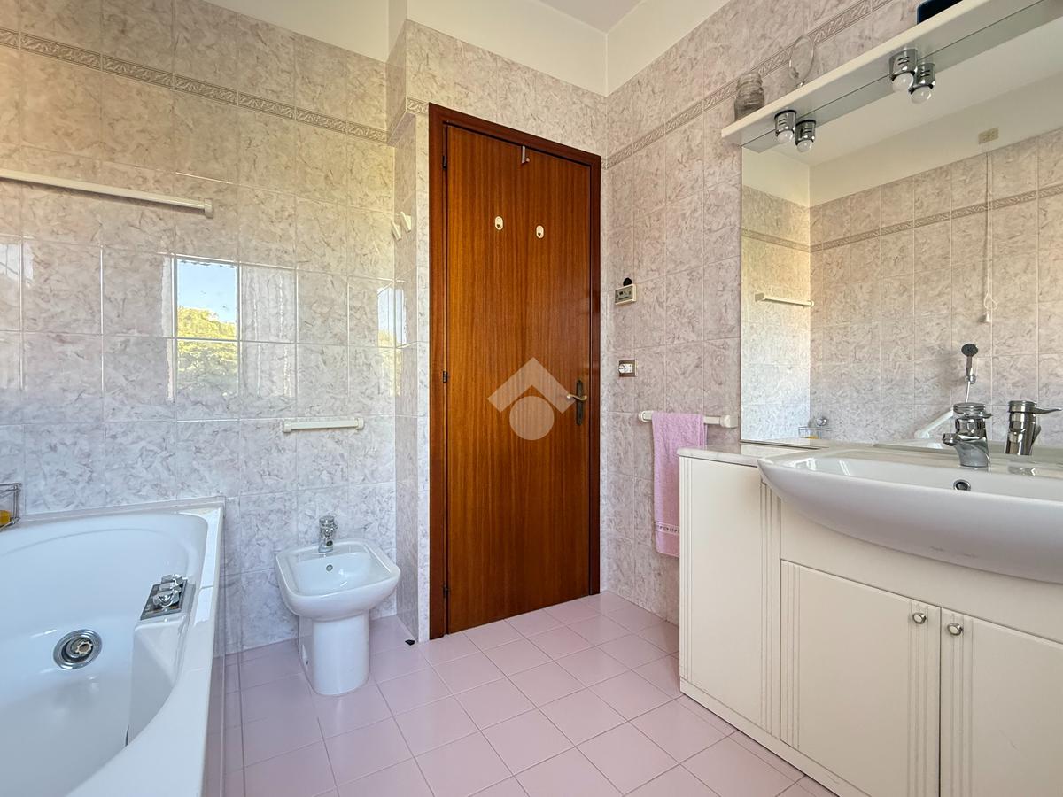 La zona notte al piano terra è ben distribuita grazie a un comodo disimpegno che conduce a due spaziose camere da letto e a un bagno finestrato dotato di vasca idromassaggio.
